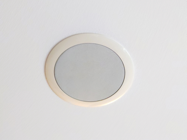 天井スピーカーとは、天井に穴を開けて本体を埋め込み音響ケーブルを天井裏に通して設置するスピーカーです。