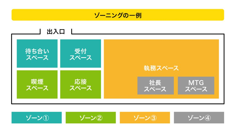 必要なスペースを挙げた後は、それぞれの配置を検討するゾーニングの工程に移ります。オフィス全体の機能を以下の4つのゾーンに分類し、出入り口から順に配置することでセキュリティと利便性を両立させます。