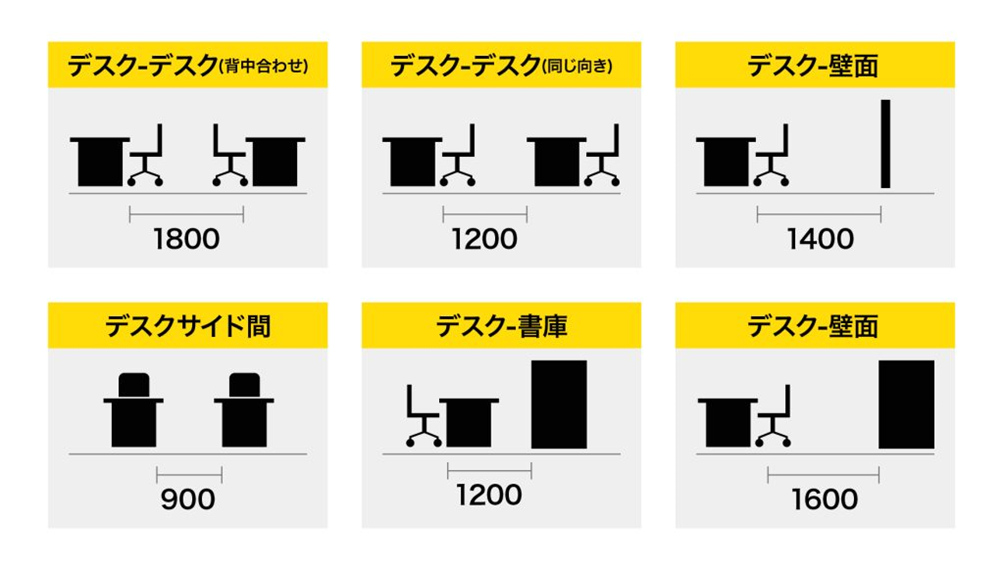 デスク同士の間隔、壁や書庫との距離などそれぞれの位置関係において推奨される通路幅を維持することで、安全で快適な移動が可能になります。スペースの確保が困難な場合は不要物の廃棄やペーパーレス化の促進、あるいは什器の小型化によって有効面積を広げる対策を検討します。